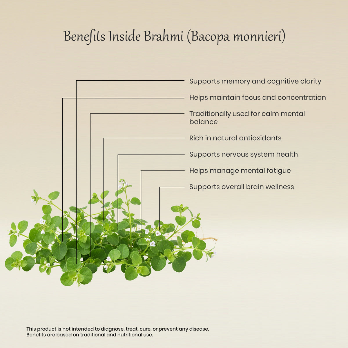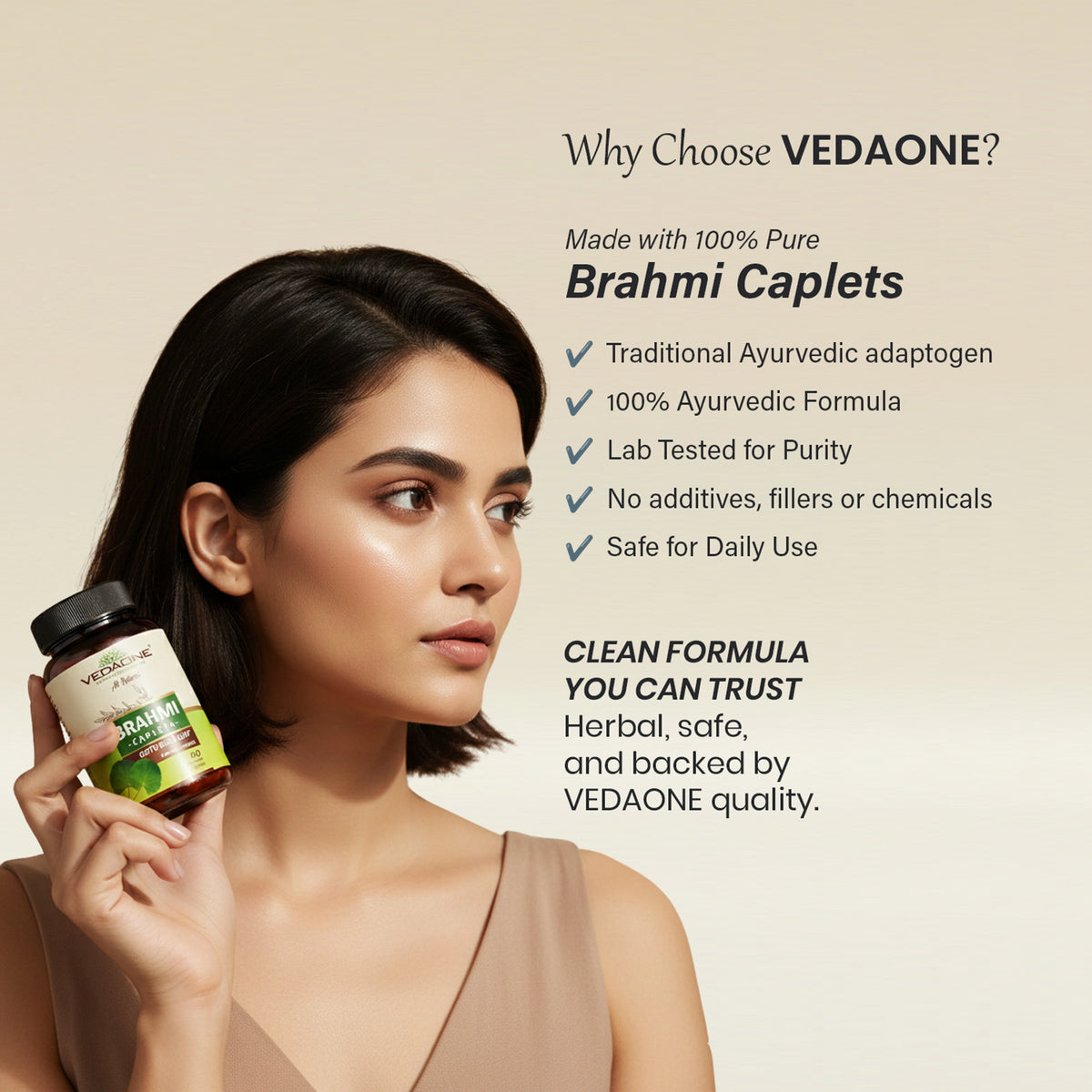 Vedaone Brahmi Caplets are formulated using Brahmi (Bacopa monnieri), a traditional Ayurvedic herb known for supporting focus, memory, and calm mental function.