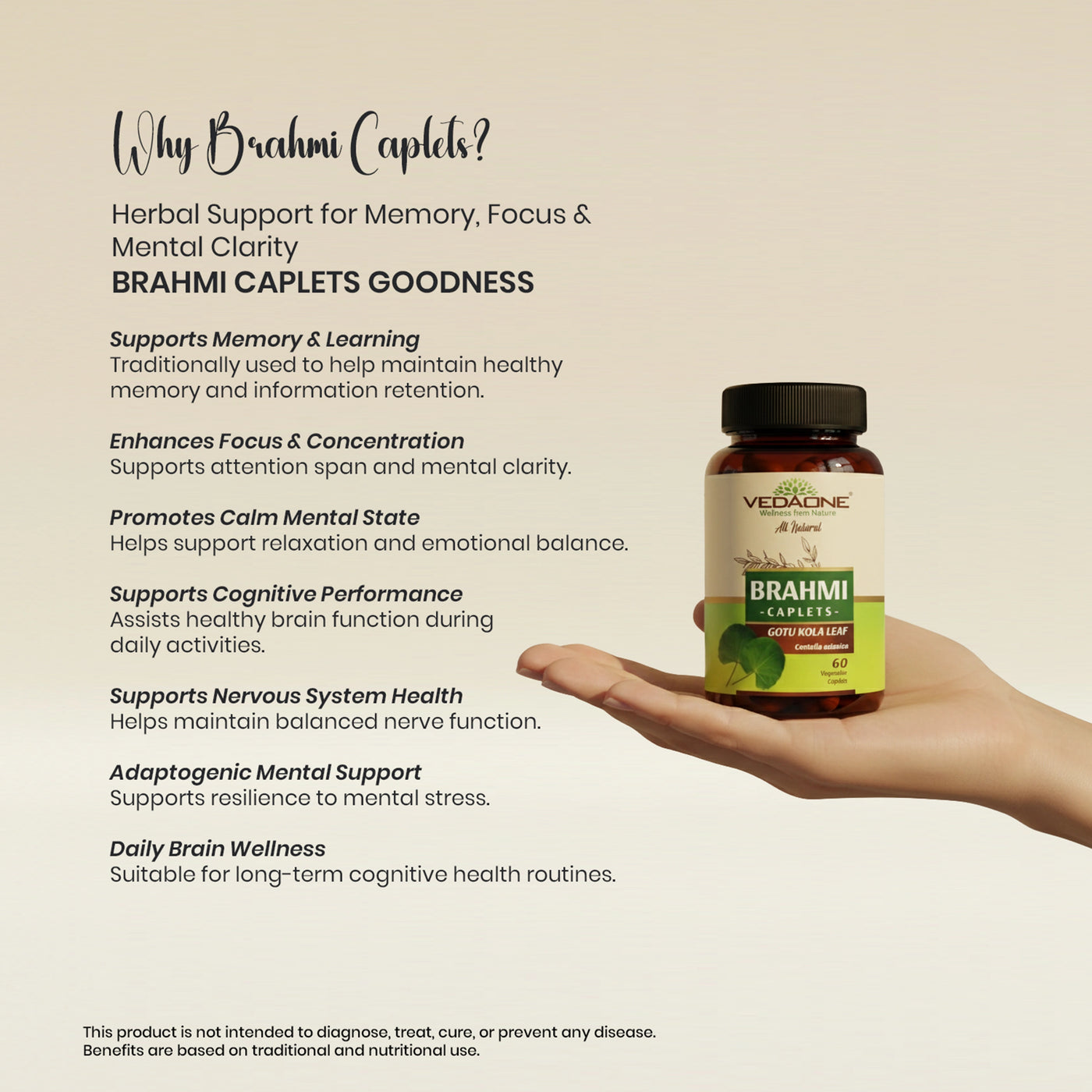 Manufactured under strict quality standards, Vedaone Brahmi Caplets are made without artificial colors, preservatives, or synthetic additives—providing clean herbal support for daily mental wellness.