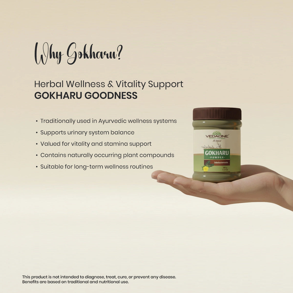 Vedaone Gokharu Powder is a pure Ayurvedic herbal powder prepared from Tribulus terrestris, traditionally used to support daily wellness, vitality, and urinary system balance.