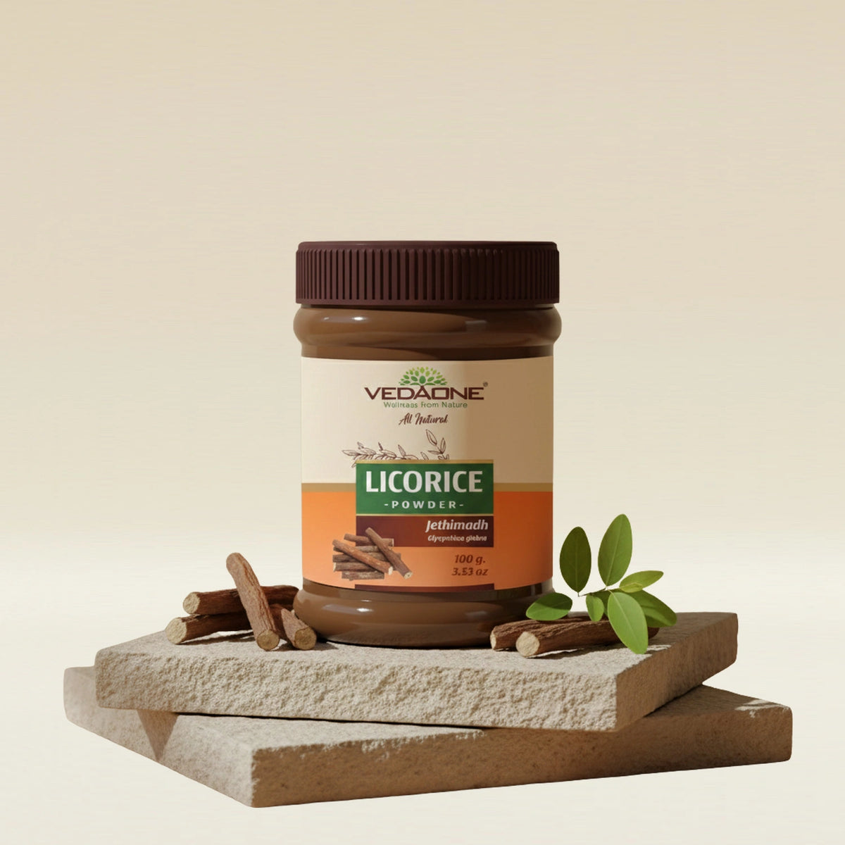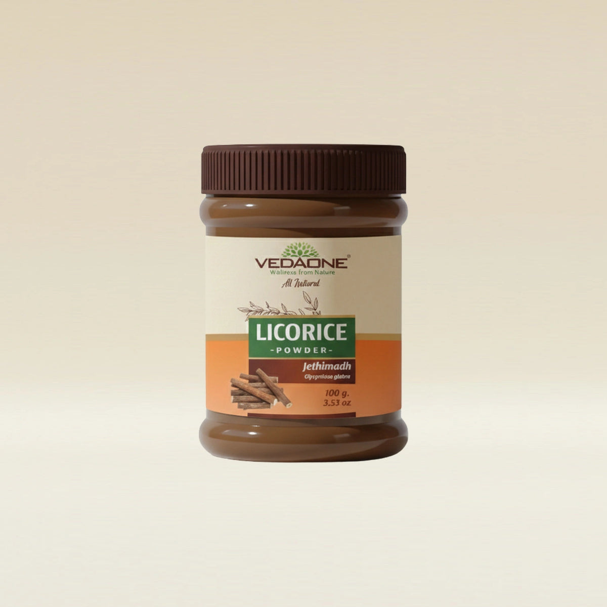 Vedaone Licorice Powder is a premium-quality herbal product prepared from pure Glycyrrhiza glabra root, a well-known botanical used across traditional wellness systems for centuries.