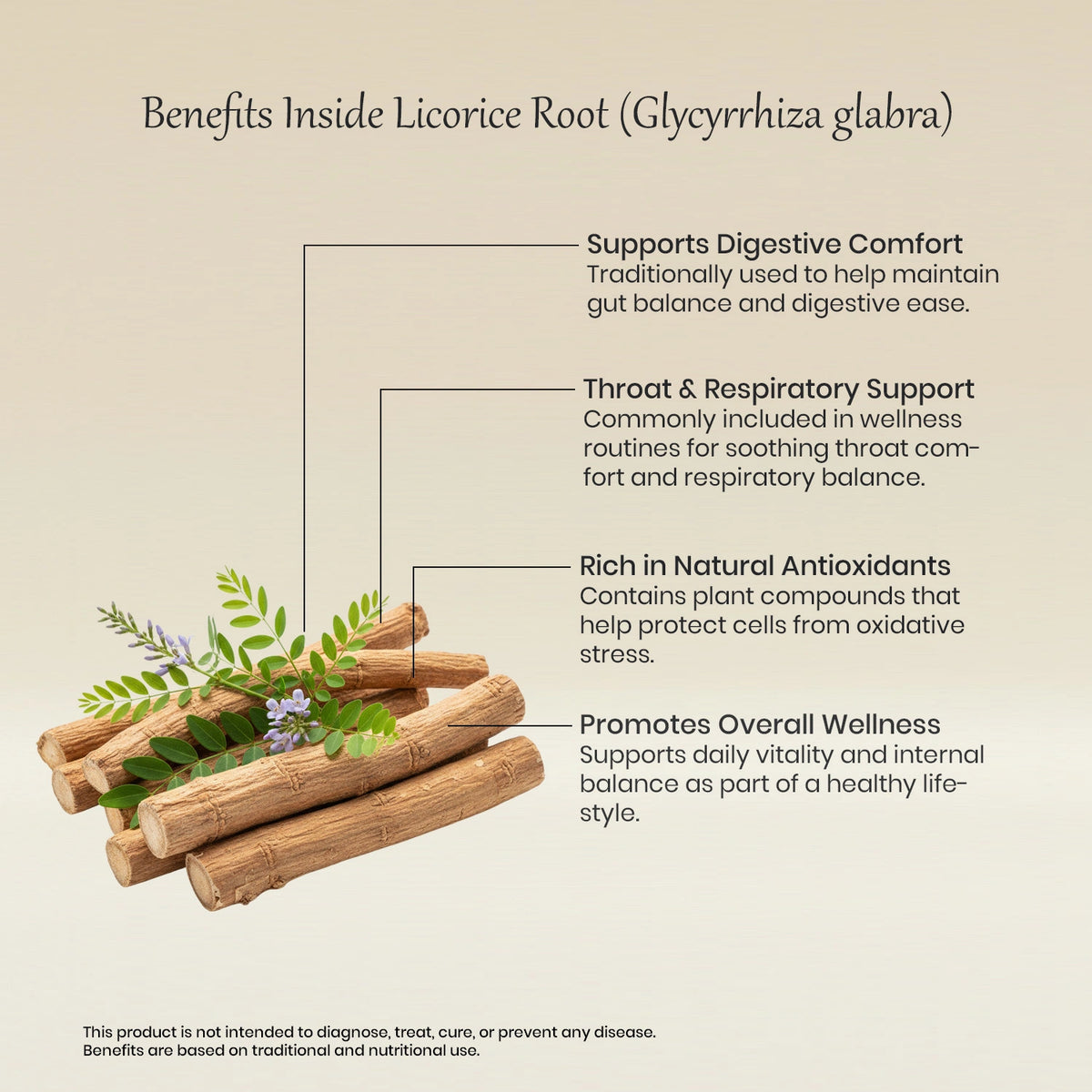 Licorice root is traditionally valued for supporting digestive comfort, soothing the throat, and maintaining respiratory balance. It is also known for its natural antioxidant properties, which help protect the body from oxidative stress and support overall vitality.