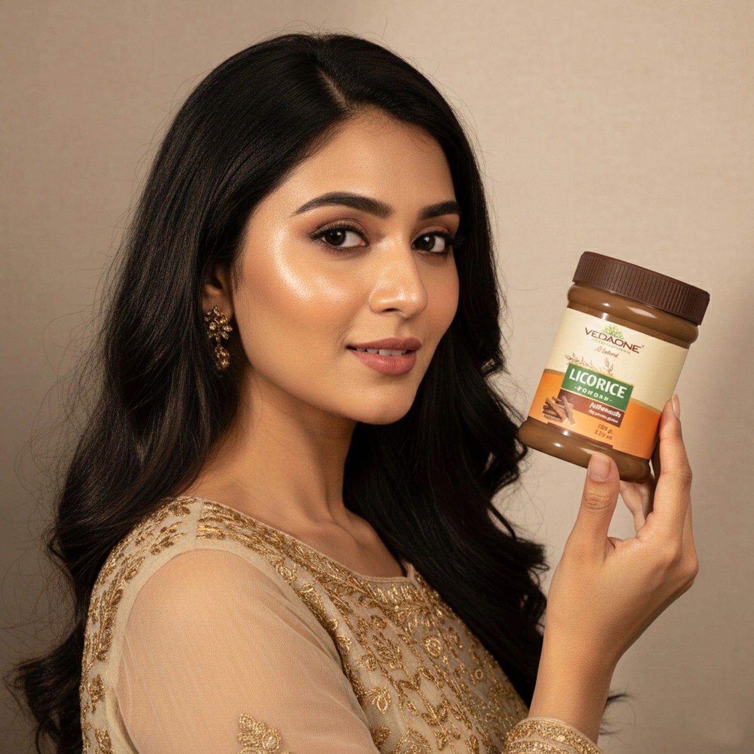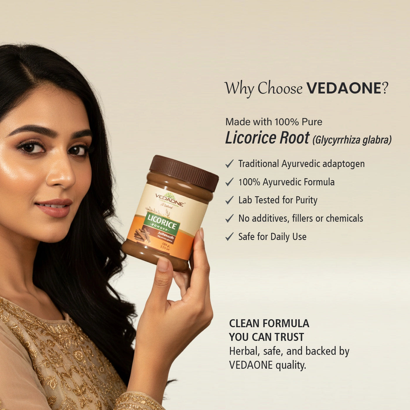 Vedaone Licorice Powder is made from 100% pure Licorice root (Glycyrrhiza glabra), traditionally used in herbal wellness practices to support digestion, throat comfort, and overall balance.