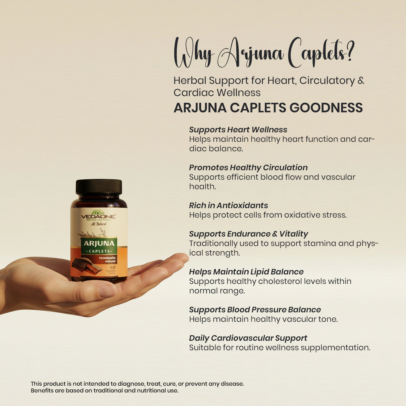 Vedaone Arjuna Caplets are formulated using Arjuna (Terminalia arjuna), traditionally used in Ayurveda to support heart function, circulation, and overall cardiovascular balance.