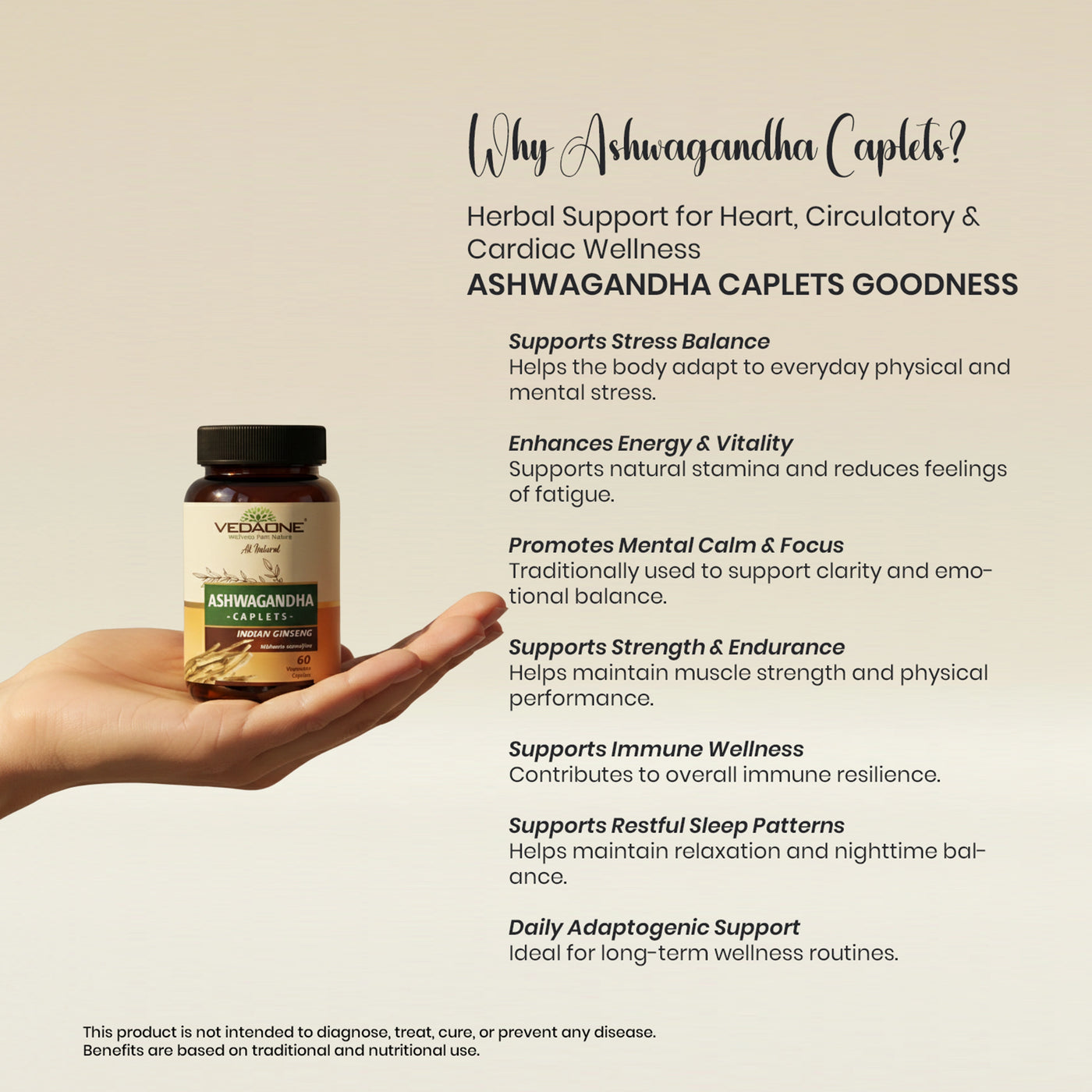 Vedaone Ashwagandha Caplets are formulated using Ashwagandha (Withania somnifera), a renowned adaptogenic herb traditionally used to support stress balance, stamina, and overall well-being.