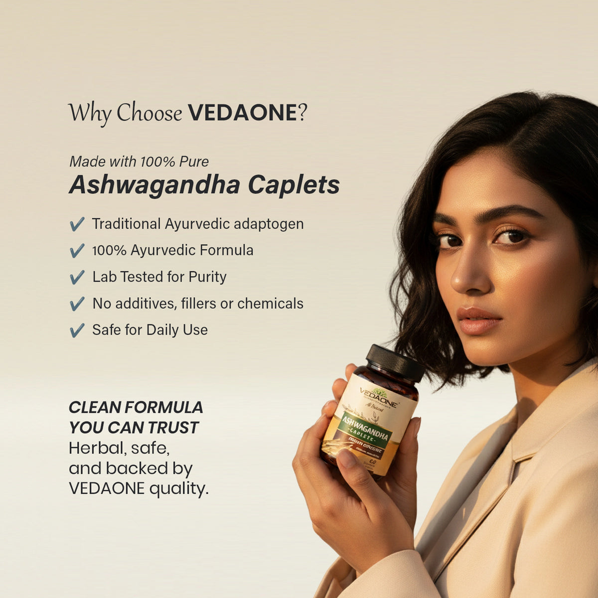 Manufactured under strict quality standards, Vedaone Ashwagandha Caplets are free from artificial additives, preservatives, and synthetic ingredients.