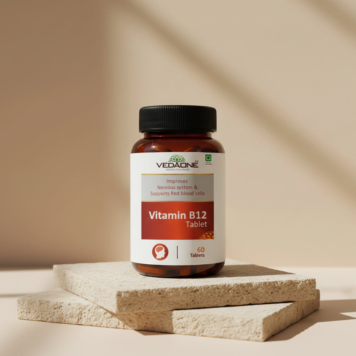 Vedaone Vitamin B12 Tablets are formulated with Vitamin B12, an essential water-soluble vitamin required for normal nervous system function, red blood cell formation, and energy metabolism.