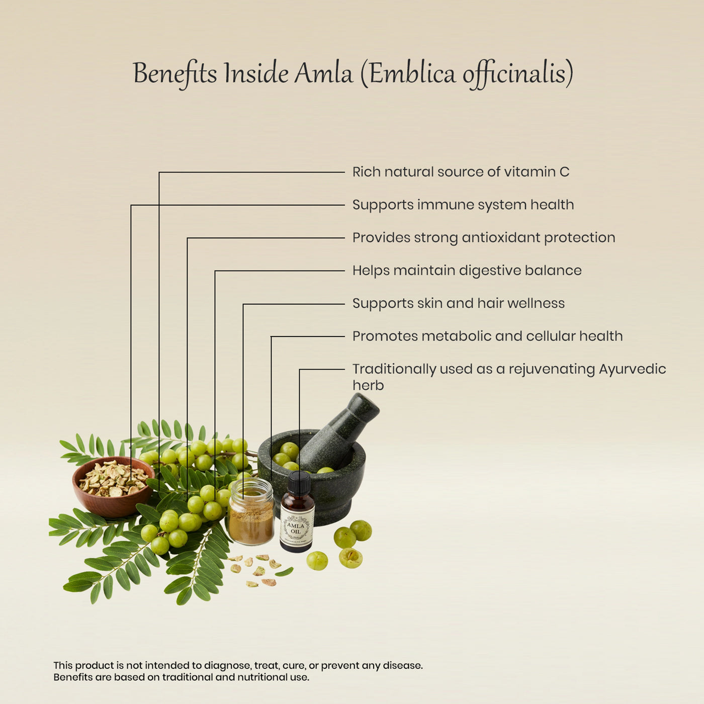 Traditionally used for digestive balance, skin health, and metabolic support, Amla also contributes to healthy energy levels and cellular protection from oxidative stress. Its adaptogenic properties help the body cope with daily physical and environmental stressors.