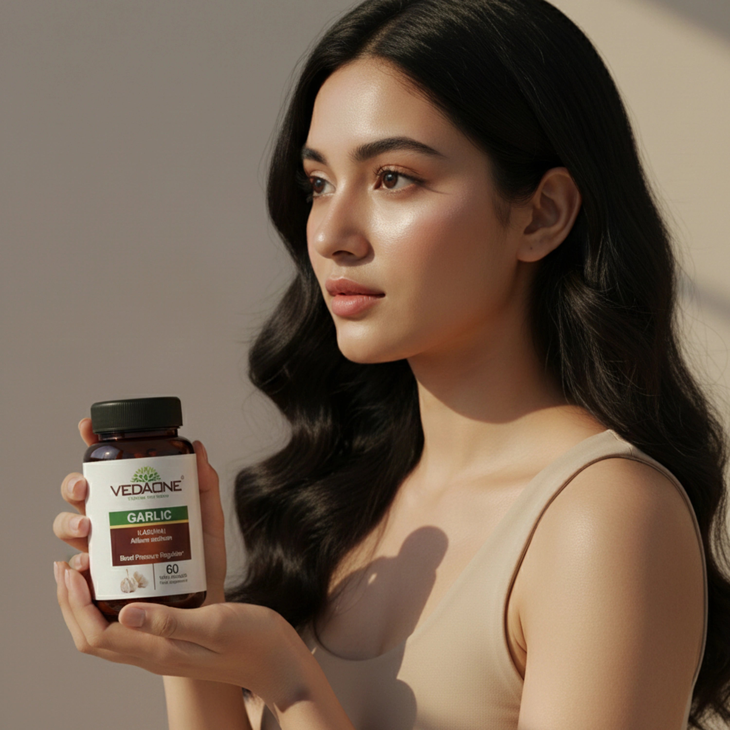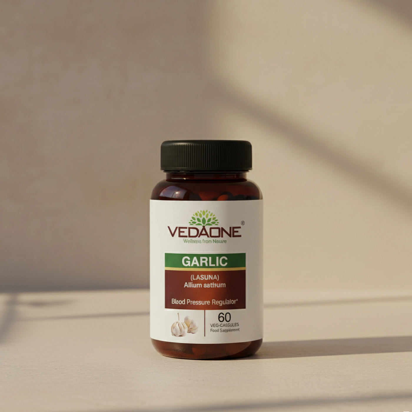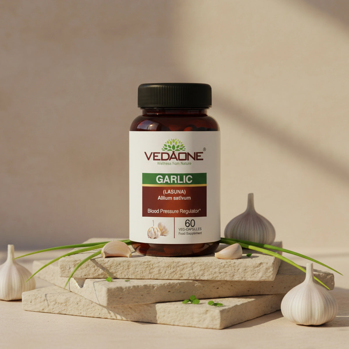 Vedaone Garlic Capsules are formulated using Garlic (Allium sativum), one of the most widely used herbs in traditional wellness systems. Garlic is valued for its natural antioxidant compounds and bioactive sulfur components, which support heart health, immune function, and circulatory balance.
